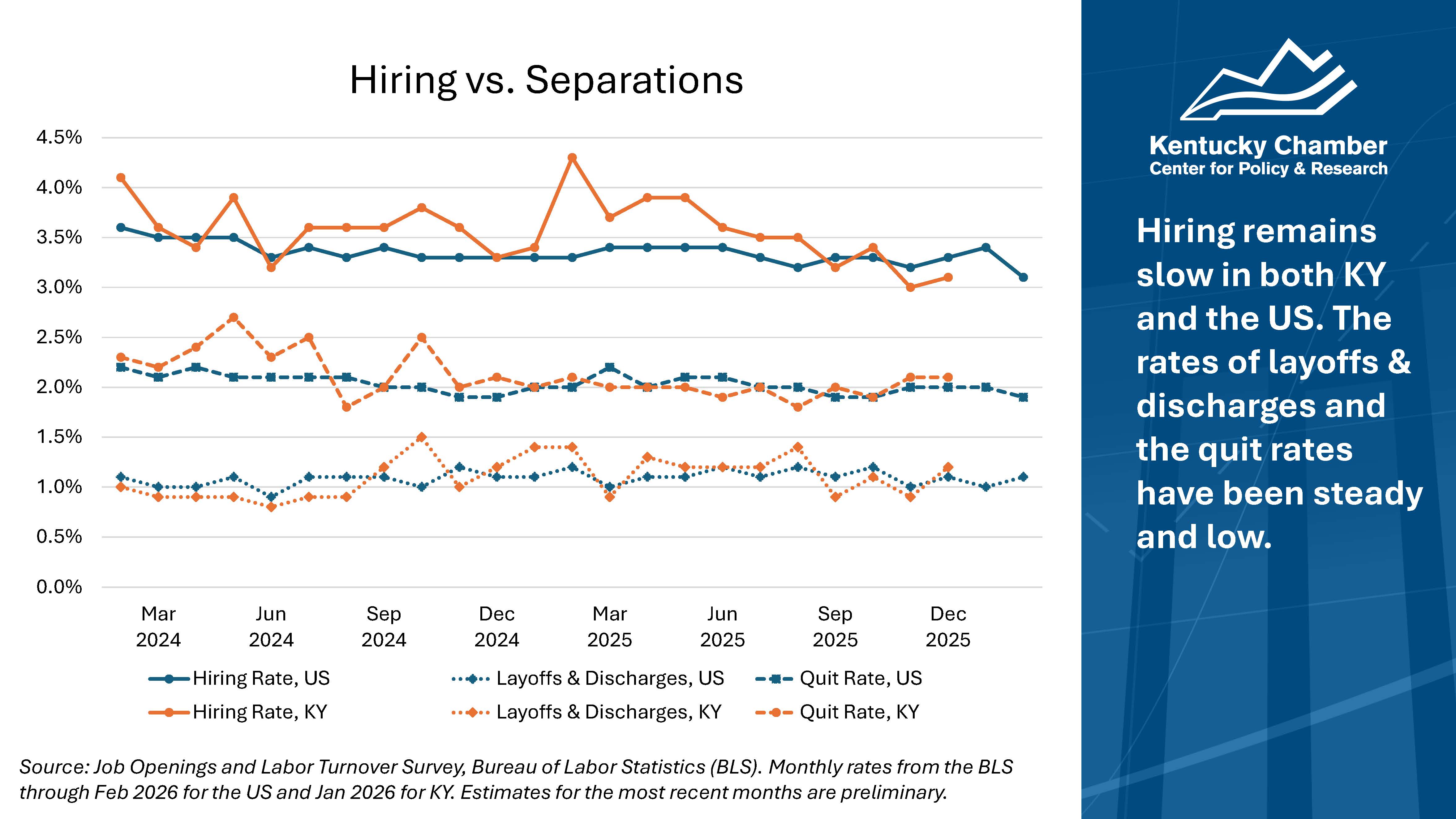 - Slow hire: Hiring in both Kentucky and the U.S. has deteriorated slowly. While the hiring rate in Kentucky was higher throughout much of 2025, it began falling in May 2025.