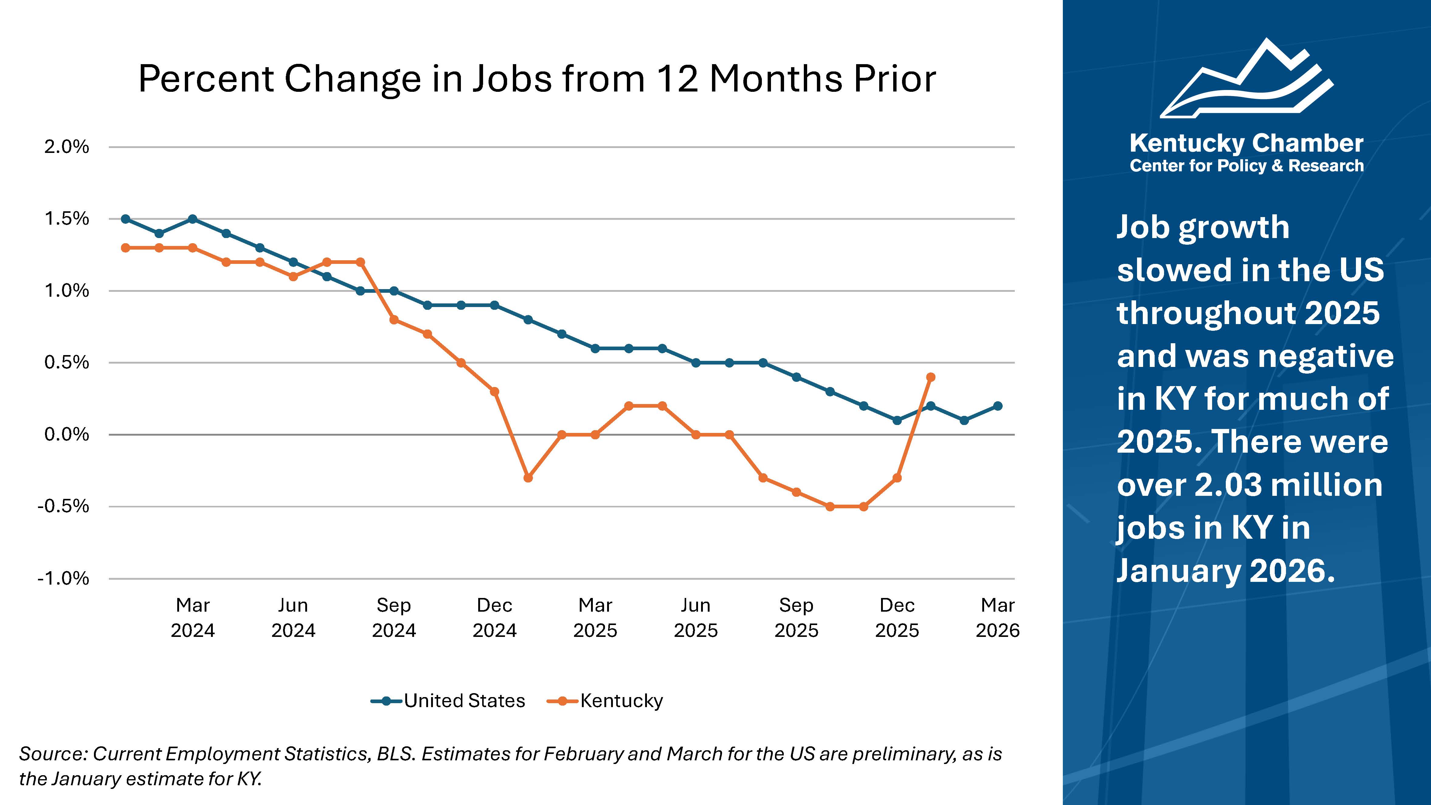 - How we look at jobs: The chart above displays job growth by showing the 12-month change in jobs as a percentage, which allows for more direct comparisons between Kentucky and the U.S. and removes the seasonality of month-to-month changes.