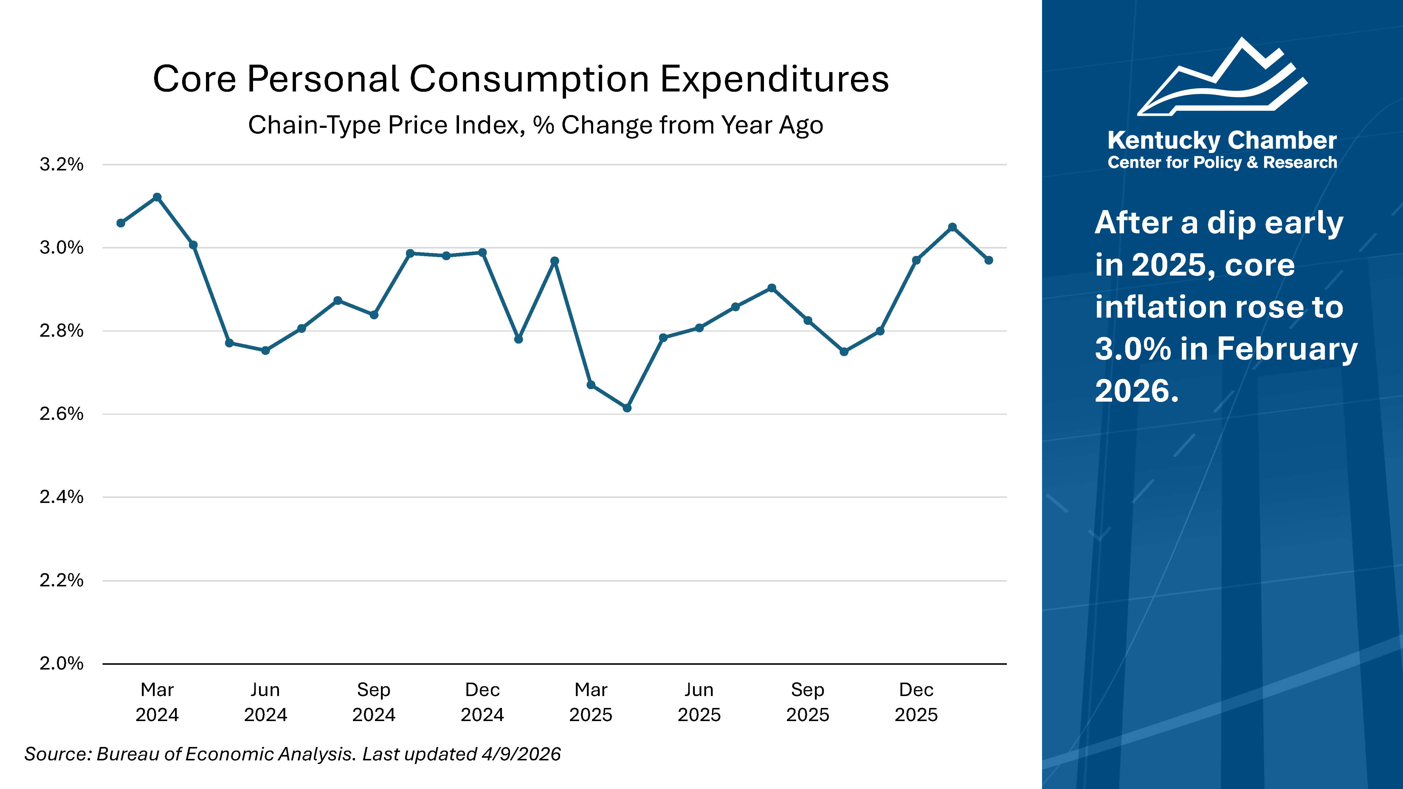 - Current rates: Between February 2024 and February 2026, rates have hovered between 2.6% and 3.2%. The increase in inflation shown since April 2025 is consistent with the effects of tariffs; however, those effects were very likely blunted by the anticipatory increase in imports earlier in the year.