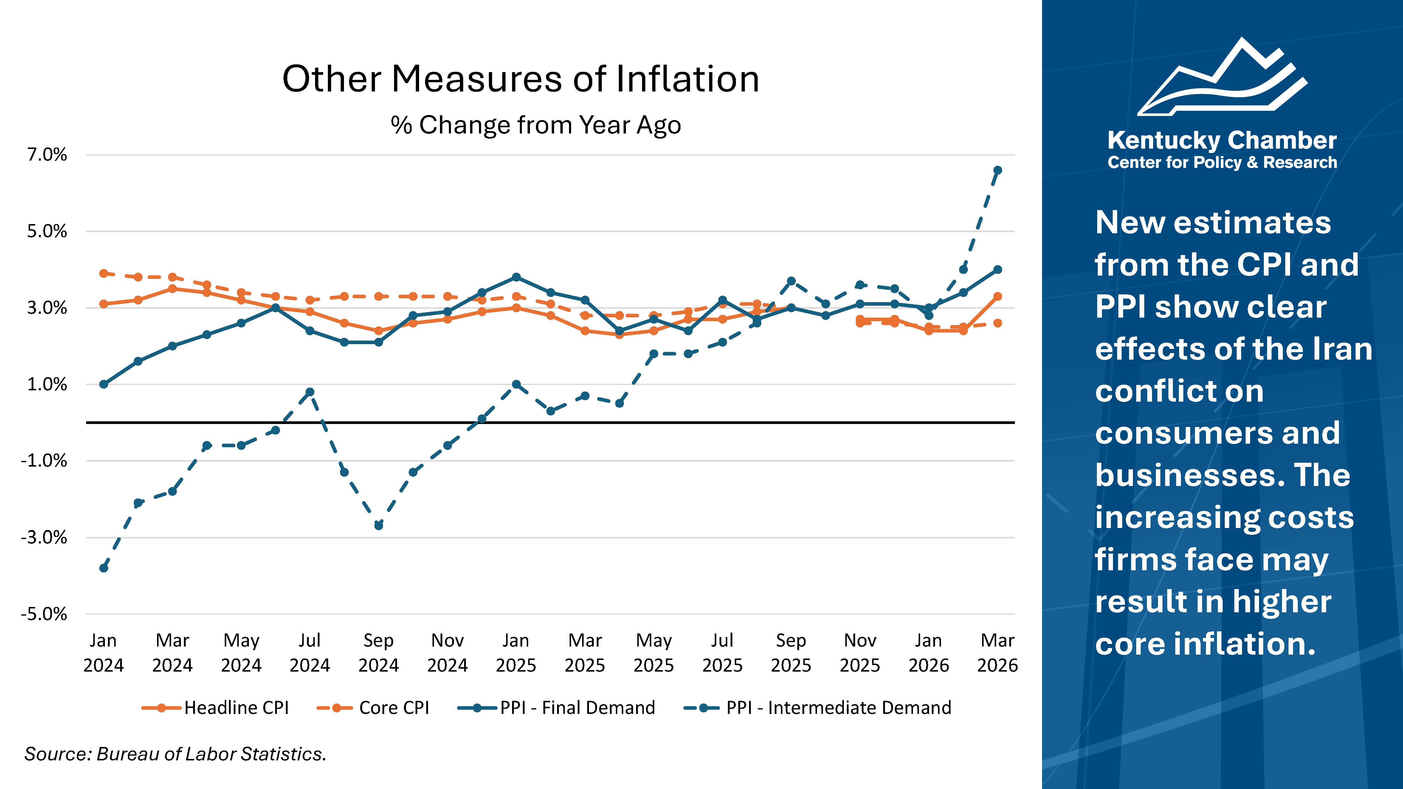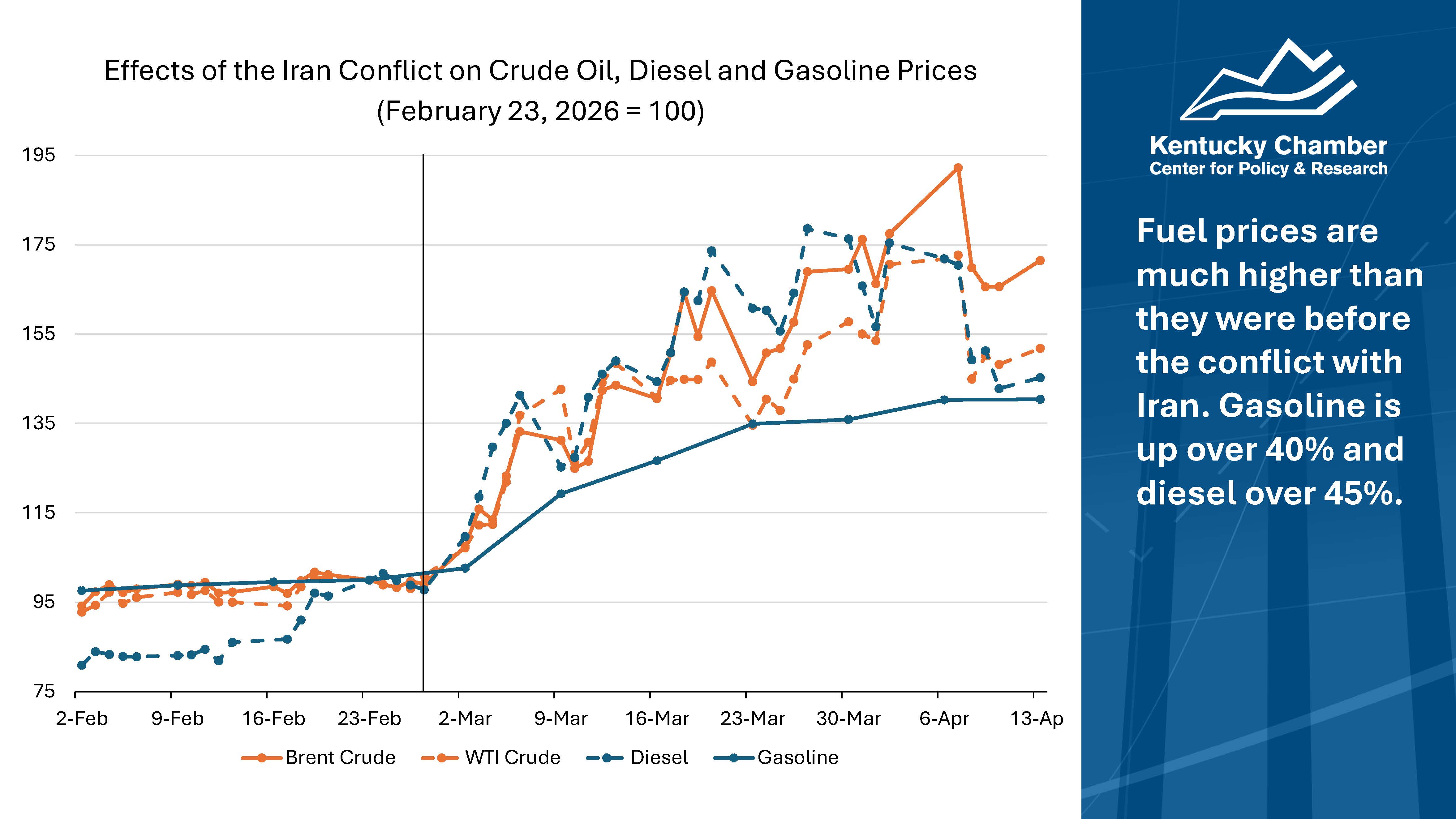 - Energy Prices: Conflict in the Middle East has caused oil, diesel, and gasoline prices to spike, with gasoline prices in Kentucky 40% higher than they were one year ago and diesel prices 60% higher.