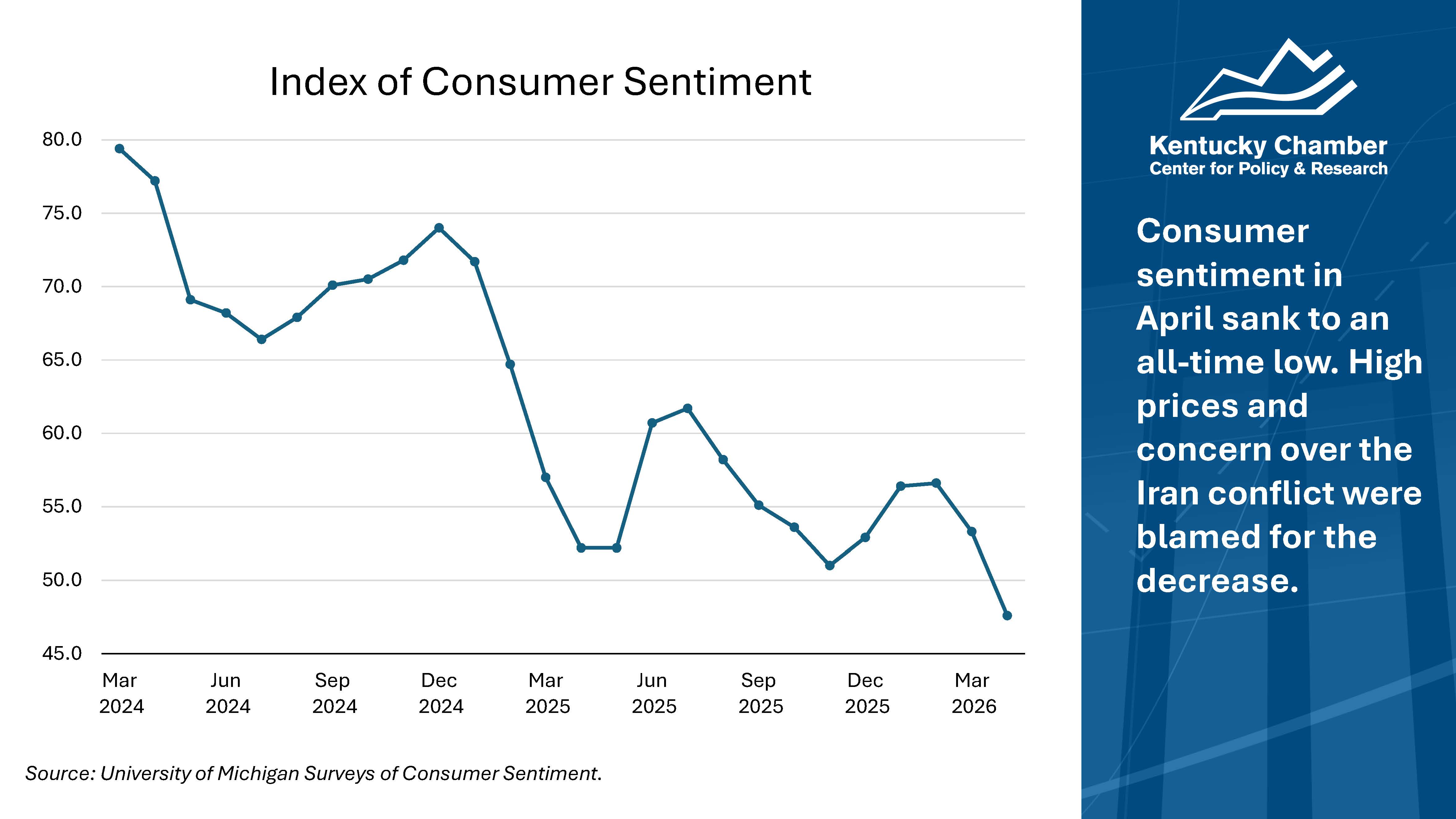 The Kentucky Chamber’s Economic Dashboard provides timely updates on economic conditions in Kentucky and across the United States. It tracks key indicators, including employment, workforce participation, hiring, inflation, consumer sentiment, and small business optimism, to help business leaders and policymakers understand current trends.