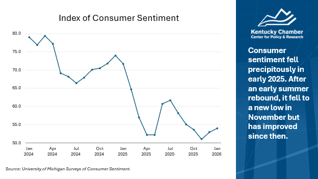 The latest economic data point to a continued cooling in both Kentucky’s and the nation’s economy. While some labor market indicators in Kentucky performed better than the U.S. overall in 2025, employment growth in the state has slowed since late spring, tracking closely with the national slowdown. National GDP expanded in the second and third quarters of 2025, driven by consumer spending, net exports, and government spending, though investment declined alongside a softer labor market. Inflation remains above the Federal Reserve’s target, and consumer sentiment has weakened further, reaching a new low in November and remaining well below levels seen at the end of 2024.