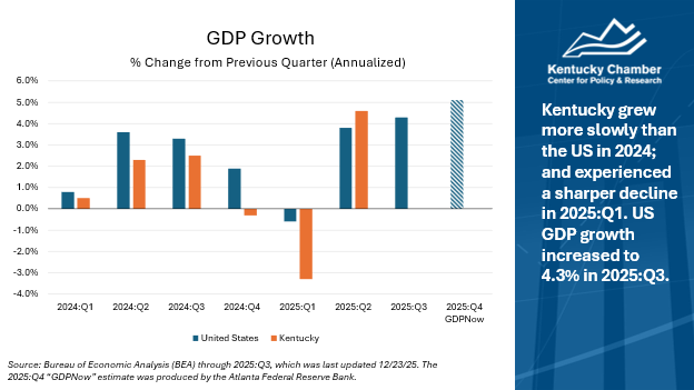 - Kentucky: The importance of manufacturing and wholesale trade to Kentucky likely explain why the changes in early 2025 were more pronounced for KY than for the US. The 2025:Q3 GDP estimate for the state is scheduled for release on January 23.
