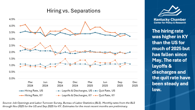 - Slow hire: Hiring in both Kentucky and the U.S. has deteriorated slowly. While the hiring rate in Kentucky was higher throughout much of 2025, it began falling in May 2025.