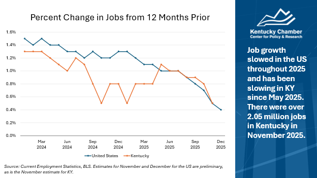 - Slower growth: Job growth slowed in the U.S. throughout most of 2025. Kentucky saw positive changes in job growth in early 2025, but growth began slowing after May.